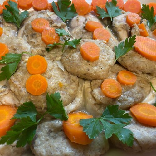 - במעבד מזון מרסקים בצל אחד ומוסיפים קרפיון טחון, ביצים, קמח מצות, סוכר, מלח ומפעילים לדקה לעירבוב.